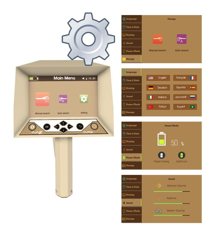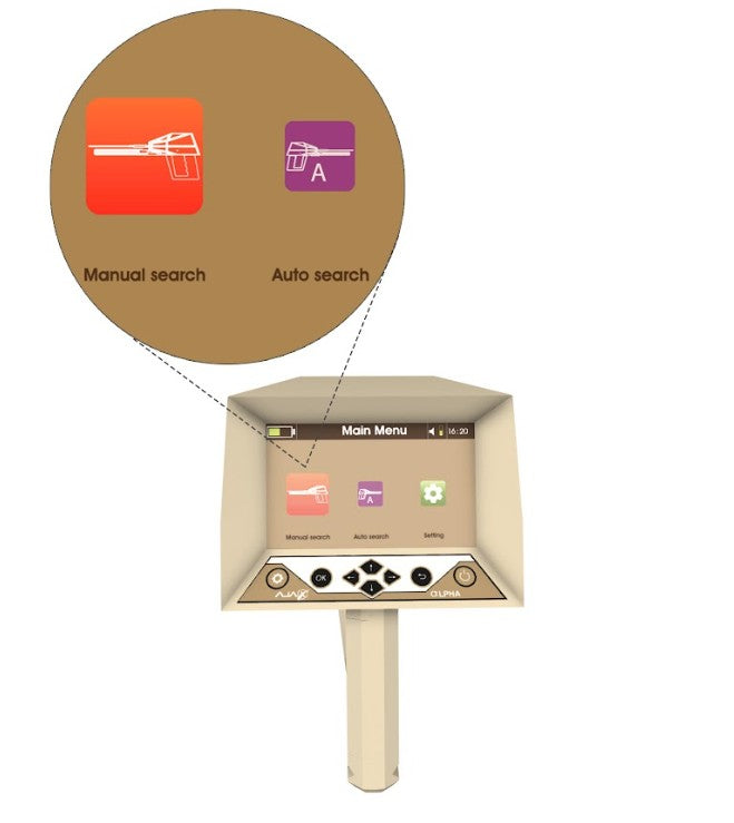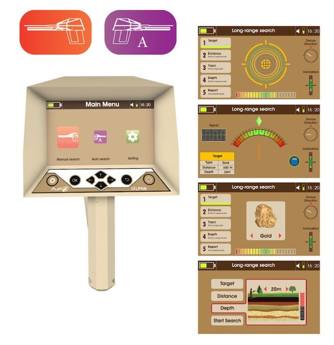 - Dual Long-Range Detection Systems (Automatic & Manual) The Alpha is equipped with two advanced long-range detection systems. The automatic system can identify targets and display their type, distance, and depth on the screen without manual input. The manual system allows users to customize search parameters, including target type, depth, and distance, providing flexibility for various prospecting needs.