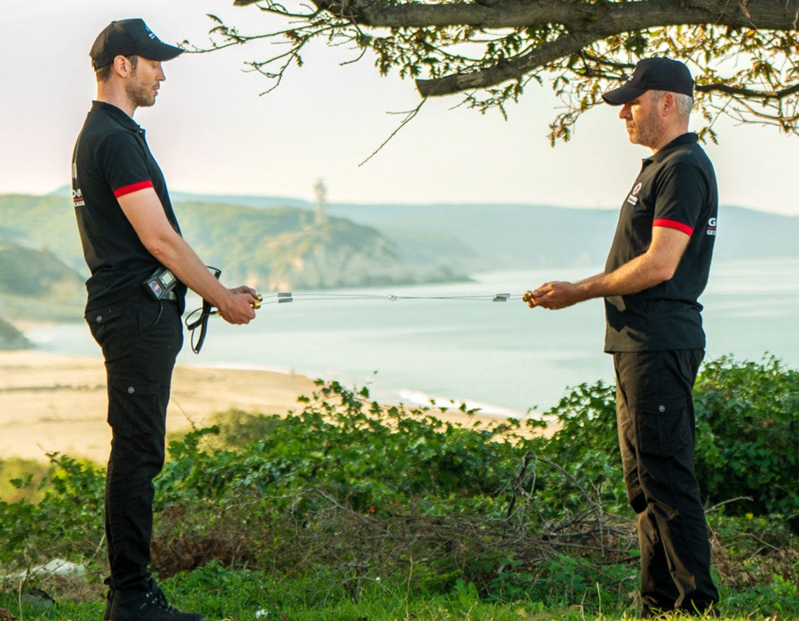 This search mode is designed for two users to operate simultaneously, using a set of copper handles. Each handle features two copper wires: one handle has ports for connecting to a linking unit via cable to the Long-Range unit, while the other handle, held by the second user, does not contain ports.