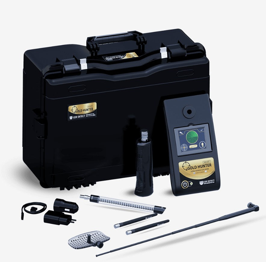 Discover the GER Detect Gold Hunter Smart — a long-range gold detector designed for accurate and reliable detection of gold, precious metals, and treasures, up to depths of 50 meters (164 feet) underground, with a front range of 3000 square meters. With smart multi-system technology and a modern touch interface, it's ideal for serious treasure hunters.