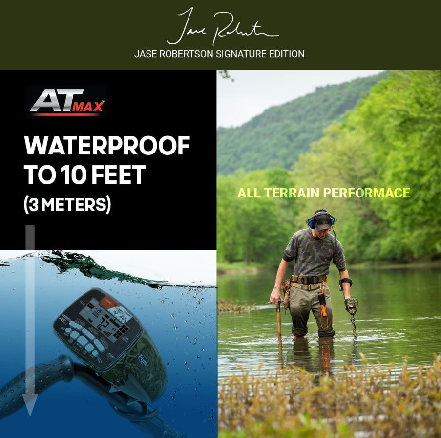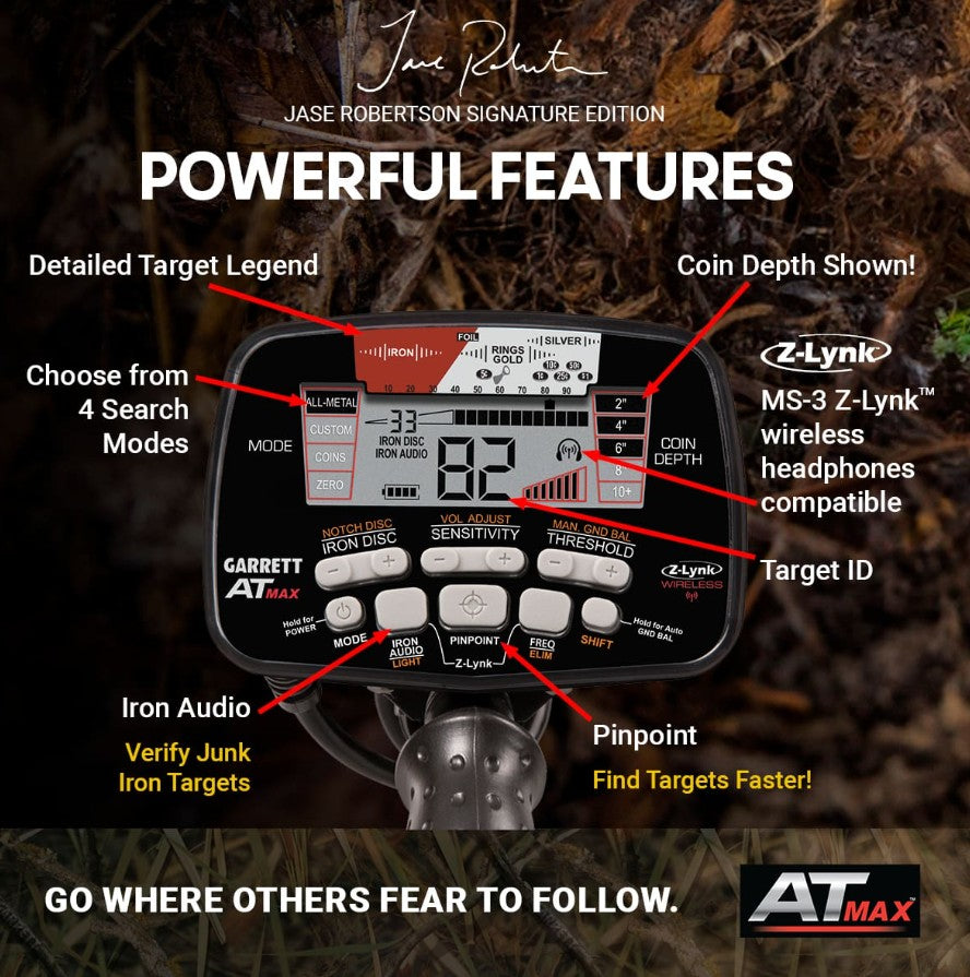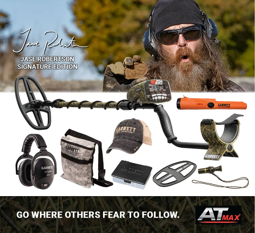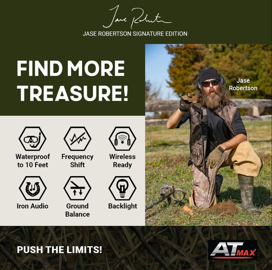 Discover the Garrett AT Max Jase Robertson Signature Edition – a powerful, all-terrain waterproof metal detector with MS-3 wireless headphones. Ideal for serious treasure hunters, it features maximum detection depth, advanced Z-Lynk wireless tech, and exclusive camo design. Perfect for relics, coins, and gold!