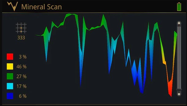 Mineral Scan identifies natural gold deposits and mineralized zones underground. The updated percentage display indicates the potential quantity of mineralized zones.